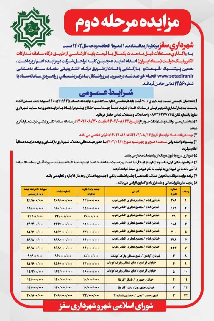 مزایده مرحله دوم شهرداری سقز جهت واگذاری ۱۳ فقره مستغلات به مدت یکسال با قیمت پایه کارشناسی