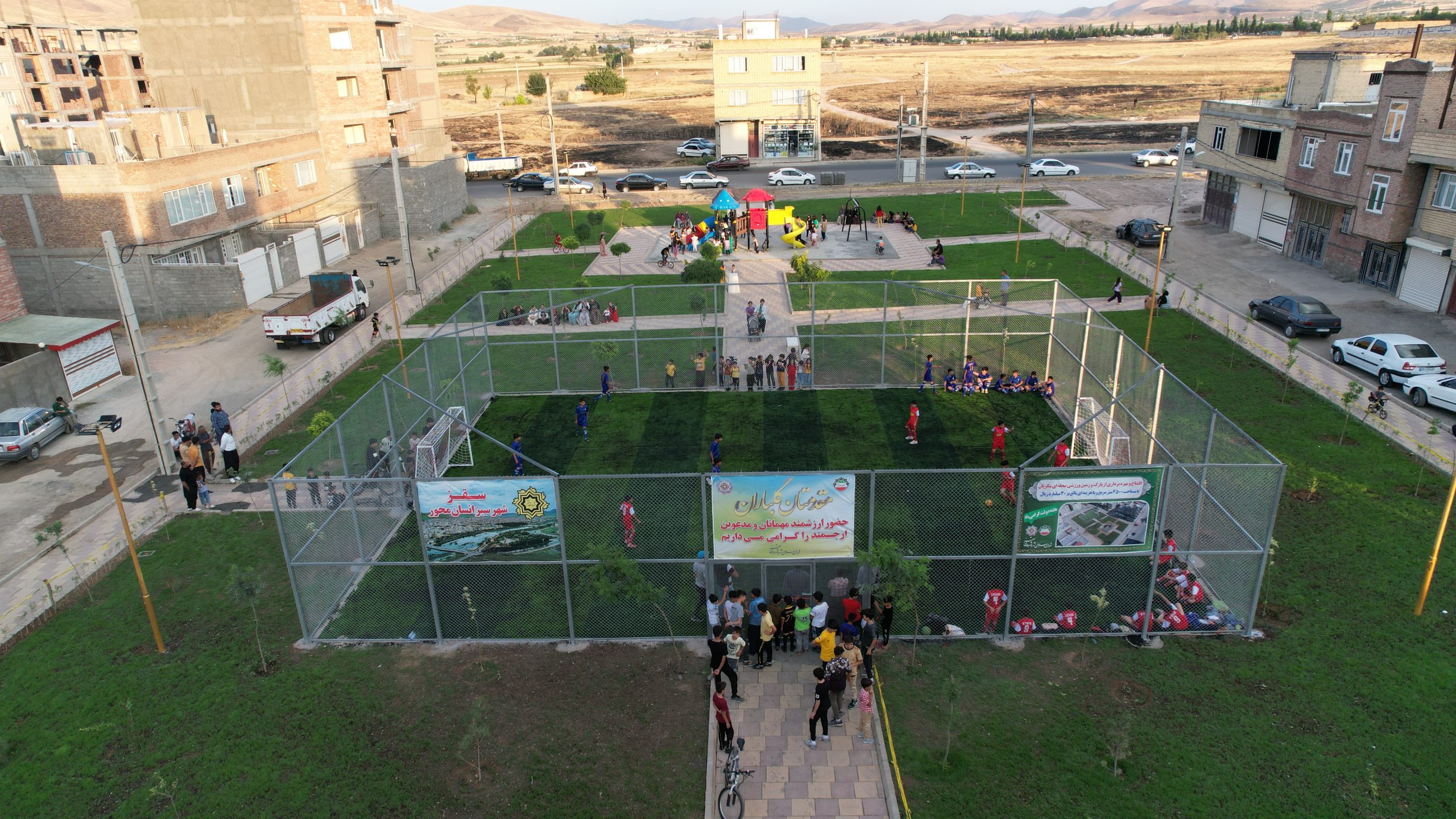– 2500متر مربع آهن کشی، نصب صفحه و بتن ریزی و نصب تور های فلزی زمین چمن مصنوعی- مدارس شهدای هسته ای، وحدت، آزادگان و پارک محله ای مکریان و…