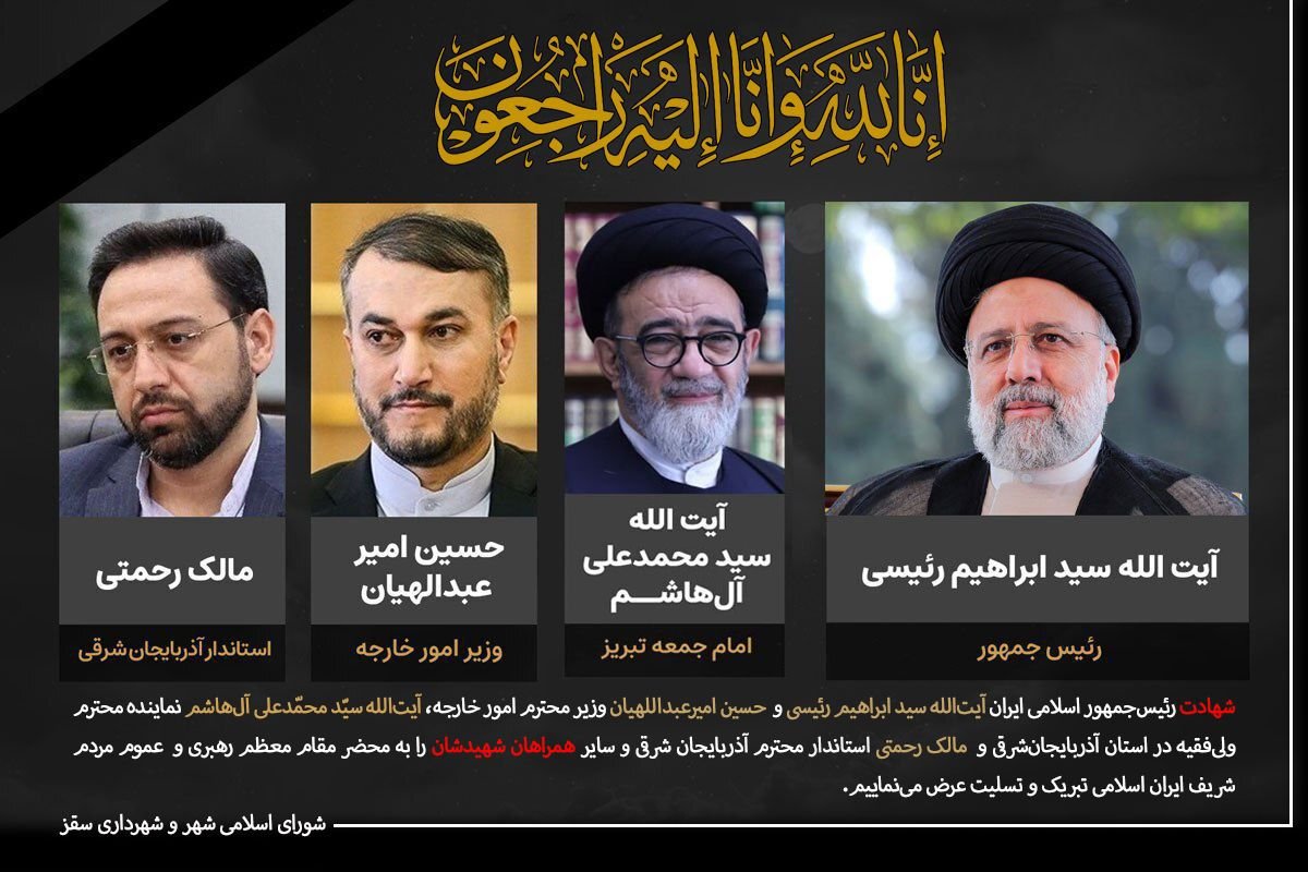 شهادت رئیسجمهور اسلامی ایران آیتالله سید ابراهیم رئیسی و حسین امیرعبداللهیان وزیر محترم امور خارجه، آیتالله سیّد محمّدعلی آلهاشم نماینده محترم ولیفقیه در استان آذربایجانشرقی و مالک رحمتی استاندار محترم و سایر همراهان شهیدشان را به محضر مقام معظم رهبری و عموم مردم شریف ایران اسلامی تبریک و تسلیت عرض مینمایم.