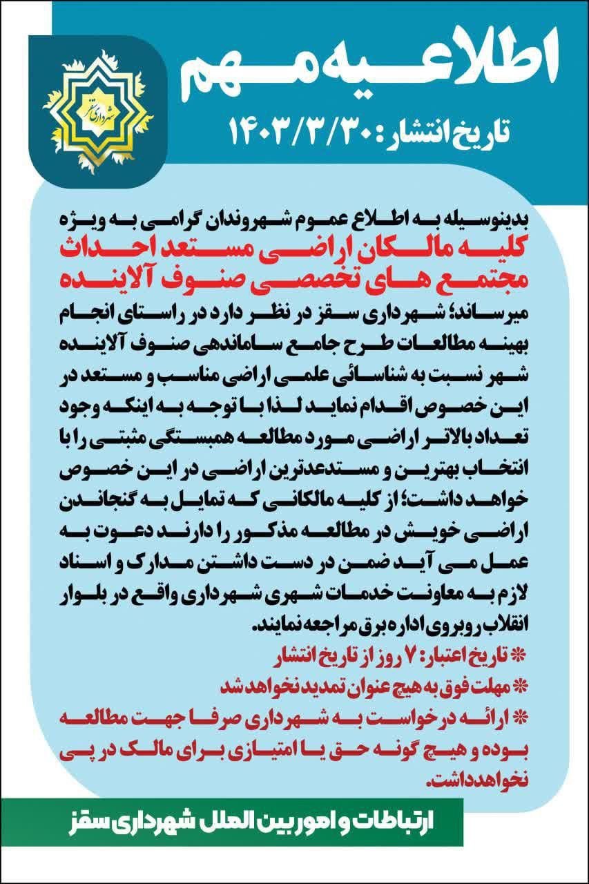 اطلاعیه شهرداری سقز در خصوص انجام بهینه مطالعات طرح جامع ساماندهی صنوف آلاینده شهر