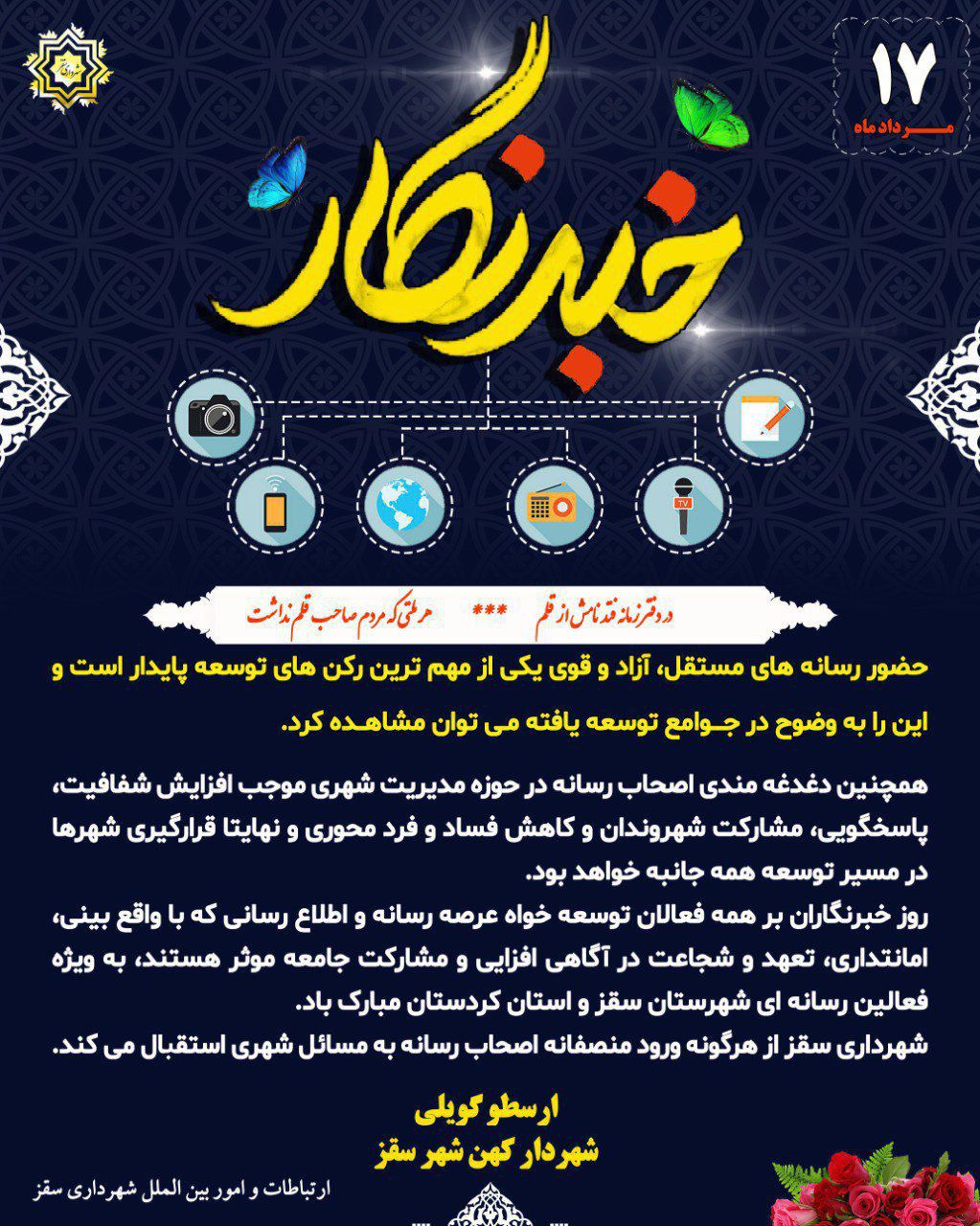 روز خبرنگاران بر همه فعالان توسعه خواه عرصه رسانه و اطلاع رسانی که با واقع بینی، امانتداری، تعهد و شجاعت در آگاهی افزایی و مشارکت جامعه موثر هستند، به ویژه فعالین رسانه ای شهرستان سقز و استان کردستان مبارک باد.