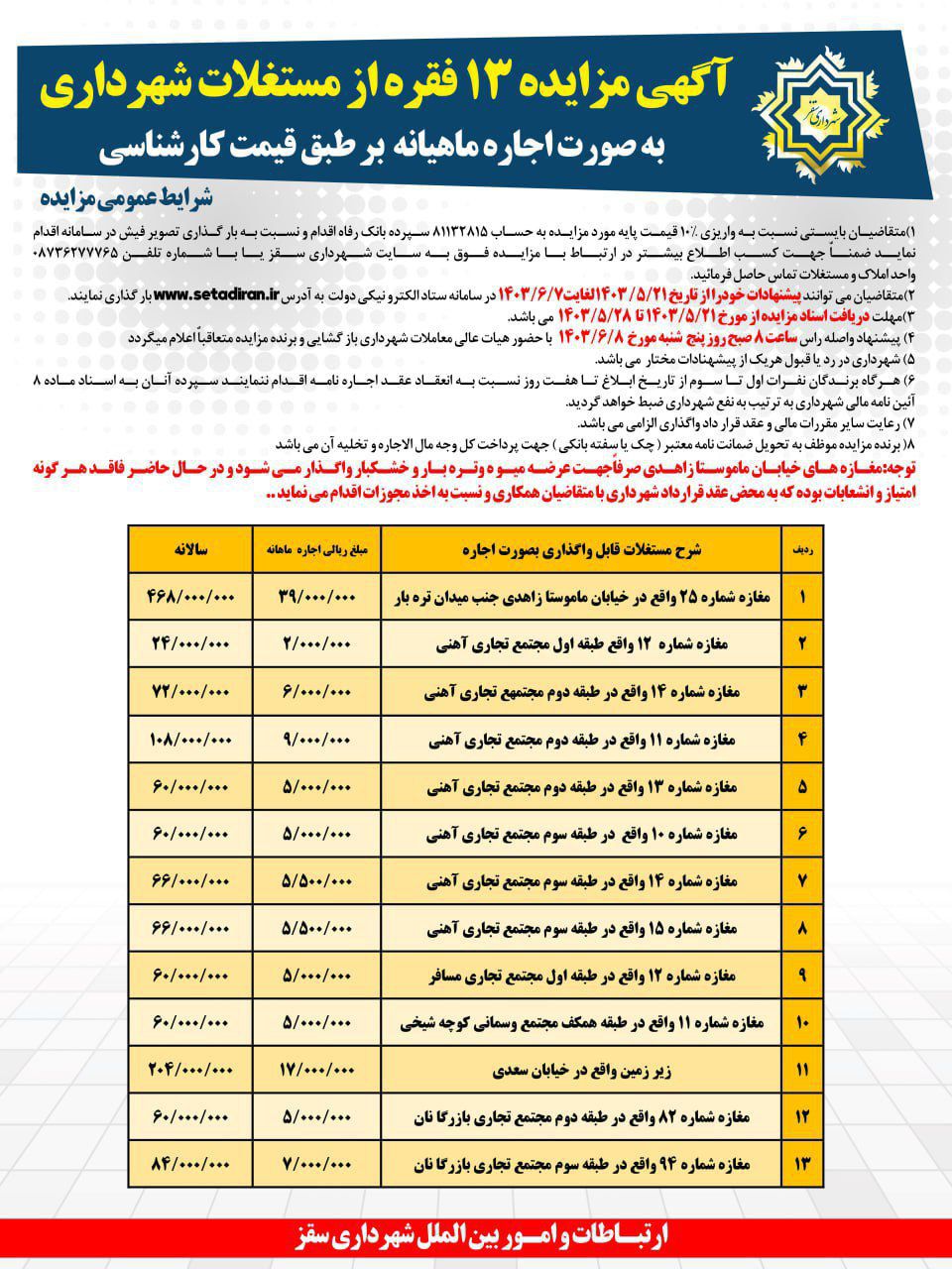 آگهی مزایده 15 فقره از مستغلات شهرداری به صورت اجاره ماهیانه به مدت یک سال طبق قیمت کارشناسی
