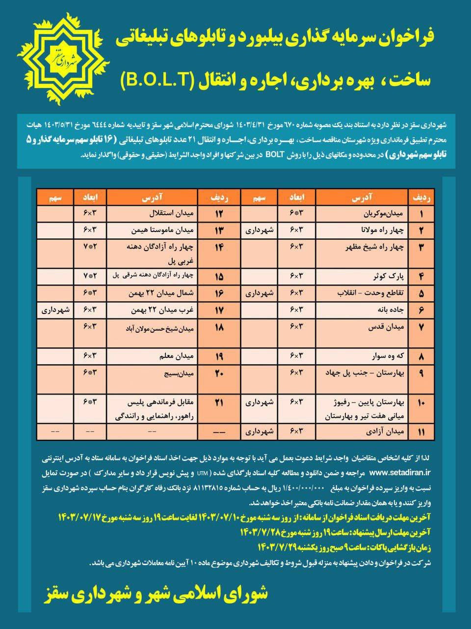 فراخوان سرمایه گذاری بیلبورد و تابلوهای تبلیغاتی به صورت ساخت، بهره برداری، اجاره و انتقال