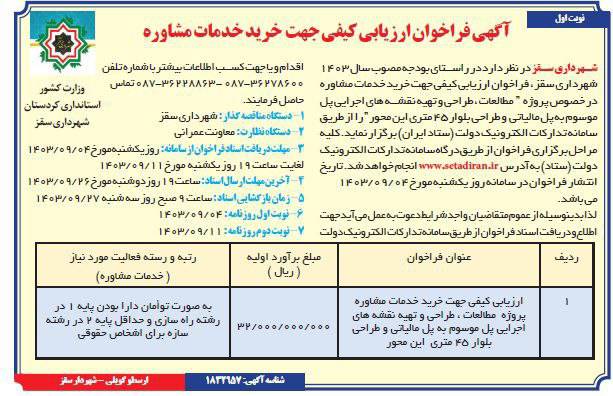 فراخوان مناقصه ارزیابی کیفی جهت خرید خدمات مشاوره پروژه مطالعات، طراحی و تعیه نقشه های اجرایی پل موسم به پل مالیاتی و طراحی بلوار ۴۵ متری این محور