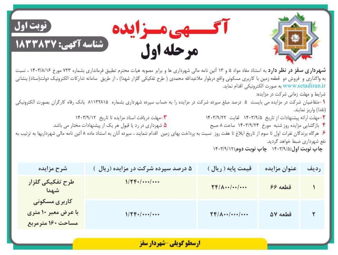 اگهی مزایده شهرداری سقز جهت فروش دو قطعه زمین با کاربری مسکونی