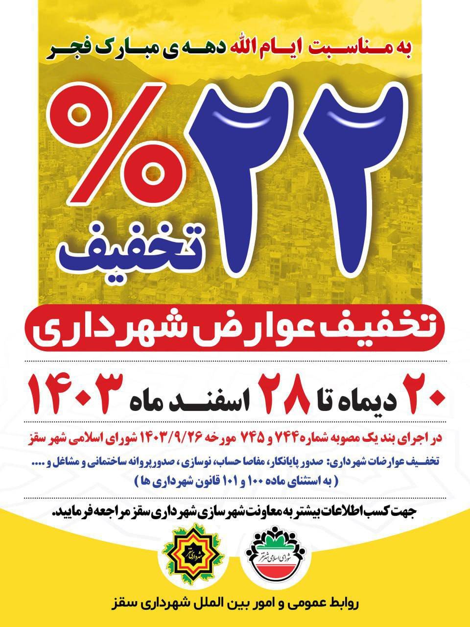 تخفیفات ۲۲ درصدی عوارض شهرداری از مورخ ۲۰ دی ماه الی ۲۸ اسفندماه سالجاری