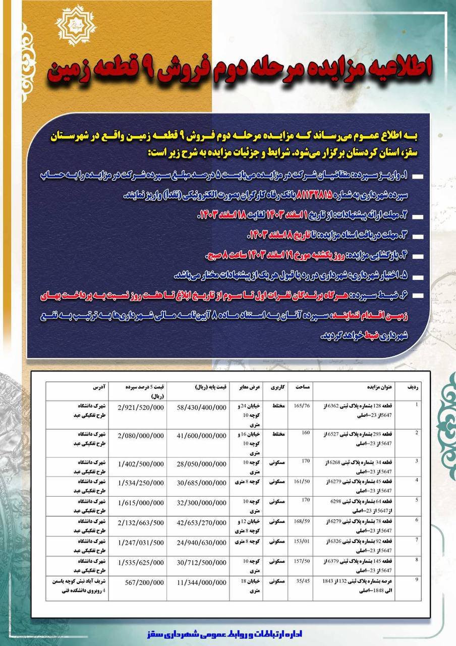 مزایده مرحله دوم شهرداری سقز جهت فروش ۹ قطعه زمین