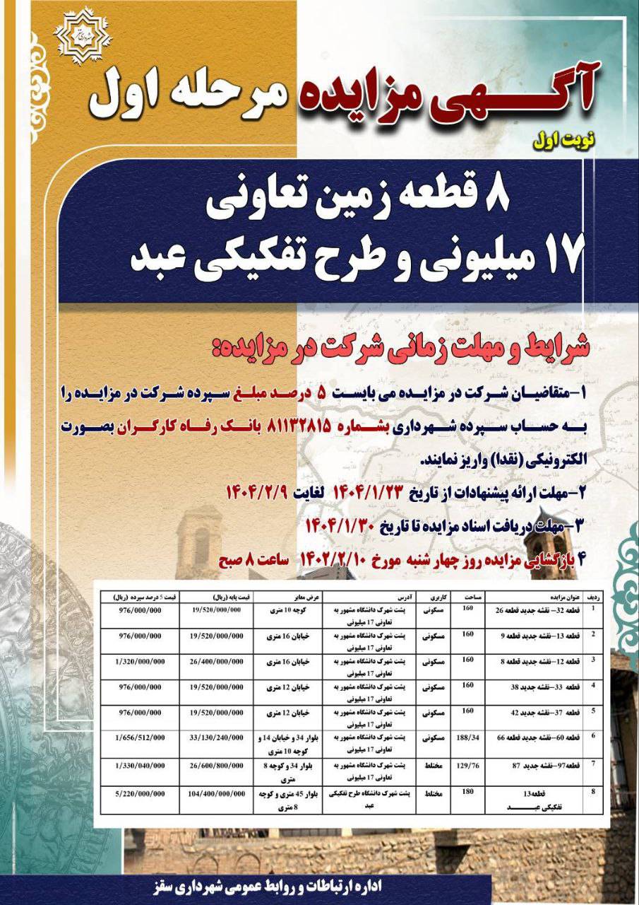 آگهی مزایده مرحله اول 8 قطعه زمین تعاونی 17 میلیونی و طرح تفکیکی عبد