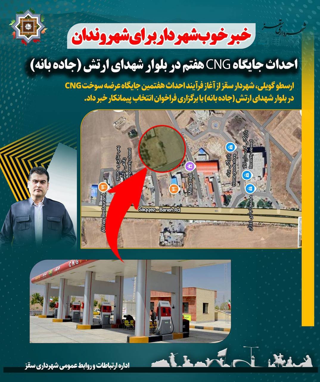🔺ارسطو گویلی، شهردار سقز از آغاز فرآیند احداث هفتمین جایگاه عرضه سوخت CNG در بلوار شهدای ارتش (جاده بانه) خبر داد. به گفته وی، فراخوان انتخاب پیمانکار برای اجرای این پروژه منتشر شده و مراحل اجرایی آن به‌زودی آغاز خواهد شد.