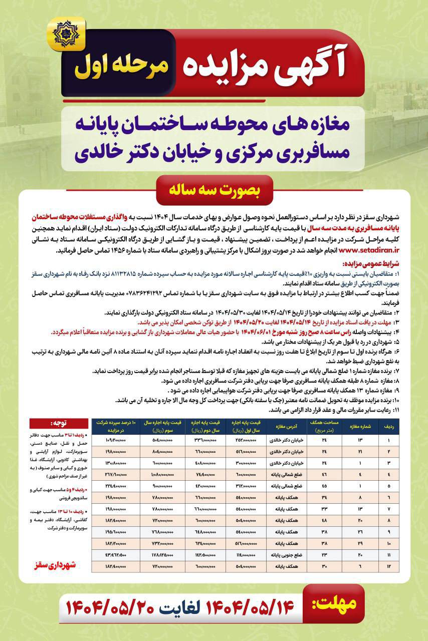 🔻آگهی مزایده مرحله اول مغازه های محوطه ساختمان پایانه مسافربری مرکزی و خیابان دکتر خالدی