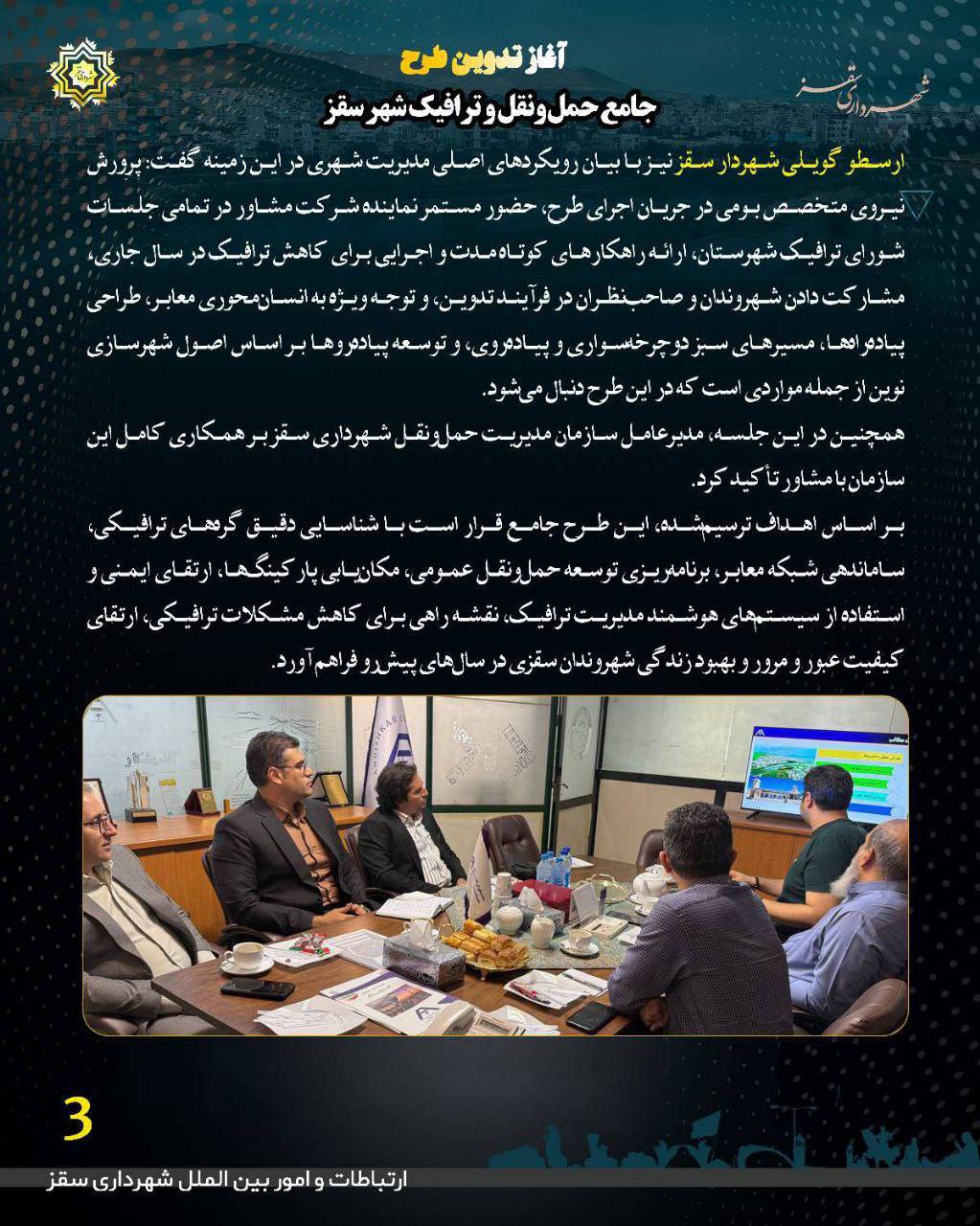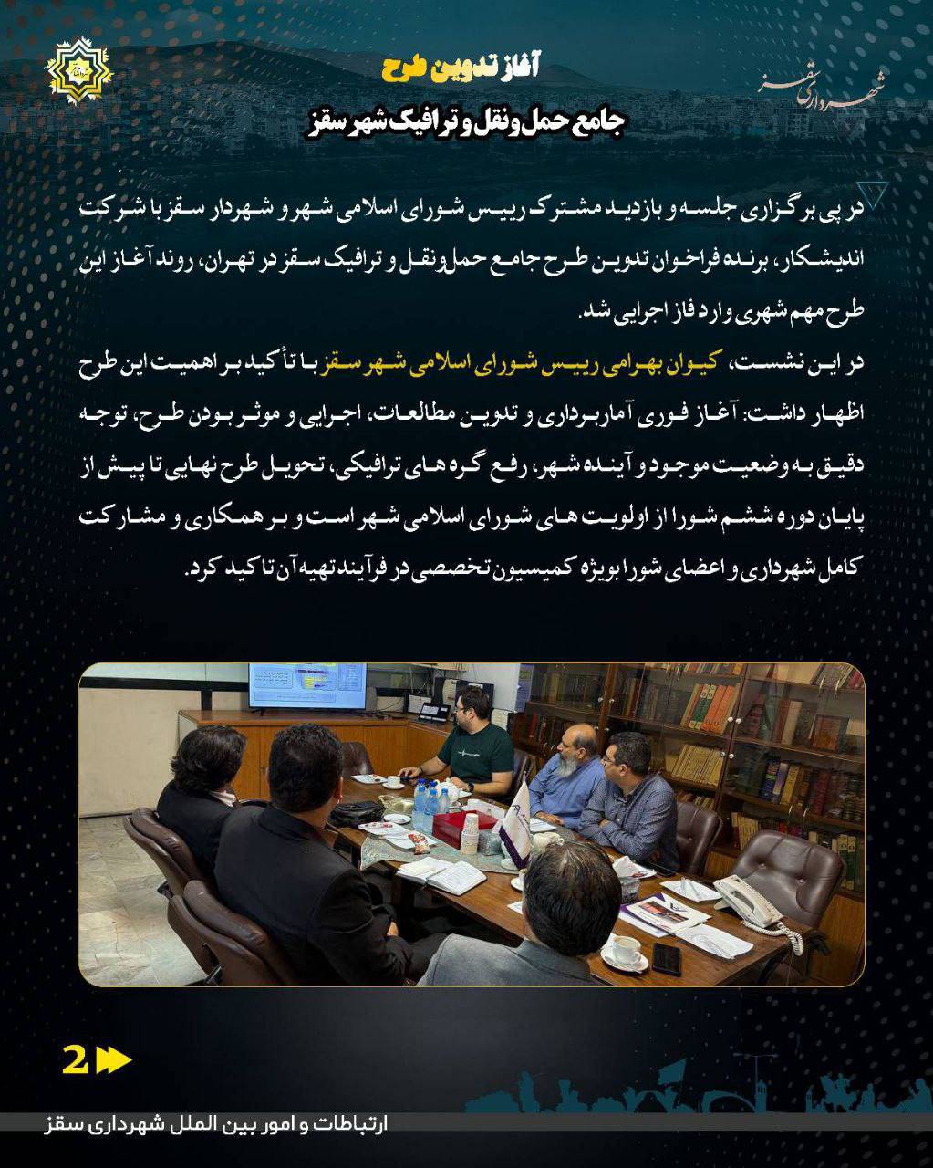 🔹در پی برگزاری جلسه و بازدید مشترک رییس شورای اسلامی شهر و شهردار سقز با شرکت اندیشکار، برنده فراخوان تدوین طرح جامع حملونقل و ترافیک سقز در تهران، روند آغاز این طرح مهم شهری وارد فاز اجرایی شد.