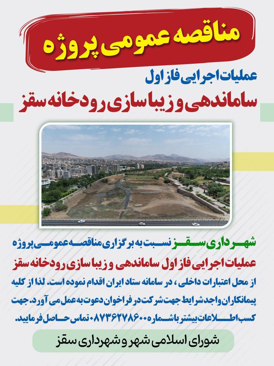 شهرداری سقز نسبت به برگزاری مناقصه عمومی پروژه “عملیات اجرایی فاز اول ساماندهی و زیبا سازی رودخانه سقز ” از محل اعتبارات داخلی ، در سامانه ستاد ایران اقدام نموده است. لذا از کلیه پیمانکاران واجد شرایط جهت شرکت در فراخوان دعوت به عمل می آورد. جهت کسب اطلاعات بیشتر با شماره 36278600-087 تماس حاصل فرمایید.
